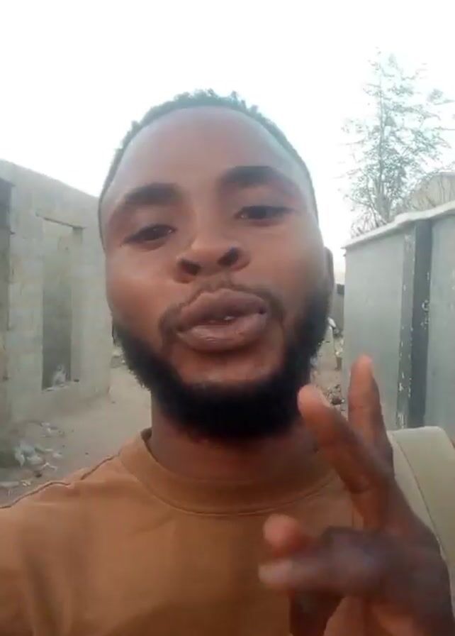A man with dark skin, a beard, and a tan t-shirt is speaking to the camera, smiling and pointing with his index finger