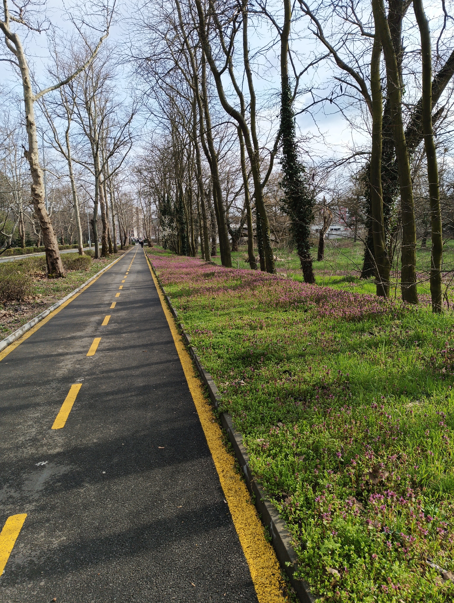 paved path running through a park. The path is black asphalt with dashed yellow lines marking the center and solid yellow lines along the edges. To the right of the path, there is a strip of green grass with small purple flowers blooming within it. A row of trees lines the right side of the path, with some trees also on the left. The trees are mostly bare of leaves, suggesting it is early spring or late fall. In the distance, there are faint figures of people walking along the path. The park appears to be located in an urban environment, and the scene seems to be in Karnobat, Bulgaria.