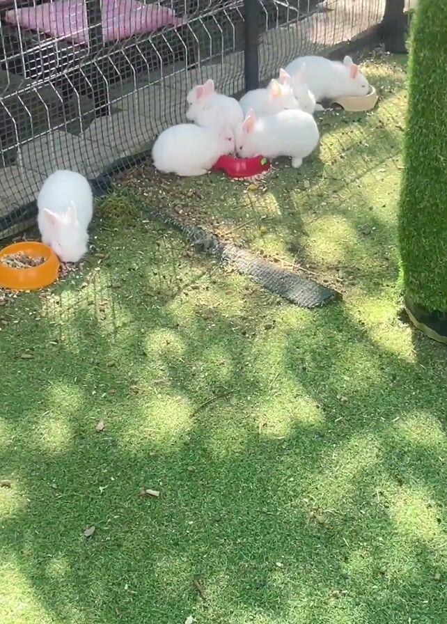 seven white rabbits in an outdoor enclosure eating from two dishes. One dish is red and the other is orange. The enclosure is fenced and sits on artificial grass. There are tables and chairs visible behind the enclosure fence. One of the tables has a Coca-Cola sign on it. There is a green pillar that looks like a fake tree.