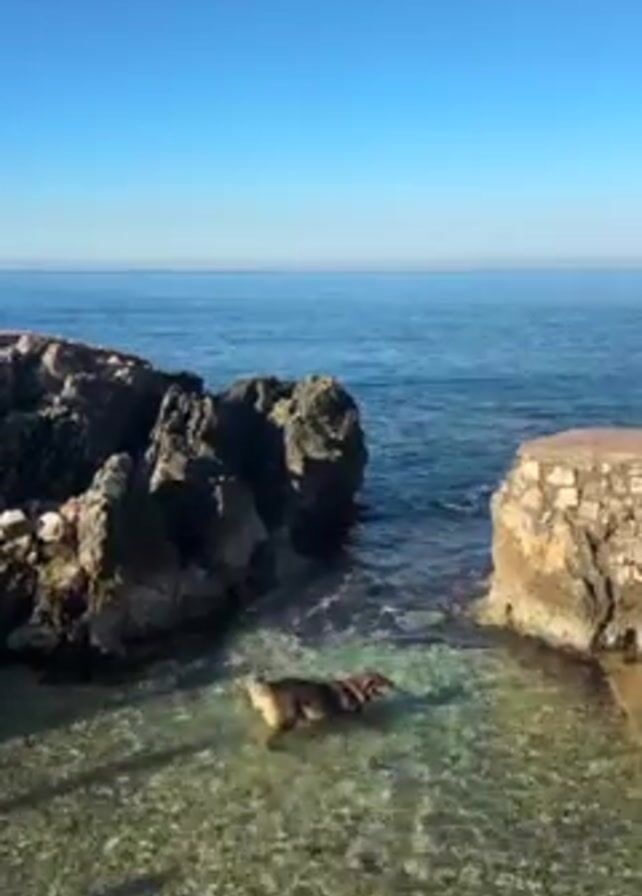 medium-sized dog standing in shallow, clear water next to a rocky coastline. The dog is brown, black, and tan, and is facing the open sea. The water is calm and clear, revealing the rocky seabed. The coastline is made up of dark, jagged rocks and a small, stone-paved area. The sky is clear and blue. The ocean stretches out to the horizon, where it meets the sky. There are no people visible in the video. The dog is the primary focus of the scene, calmly enjoying its swim in the crystal-clear water.