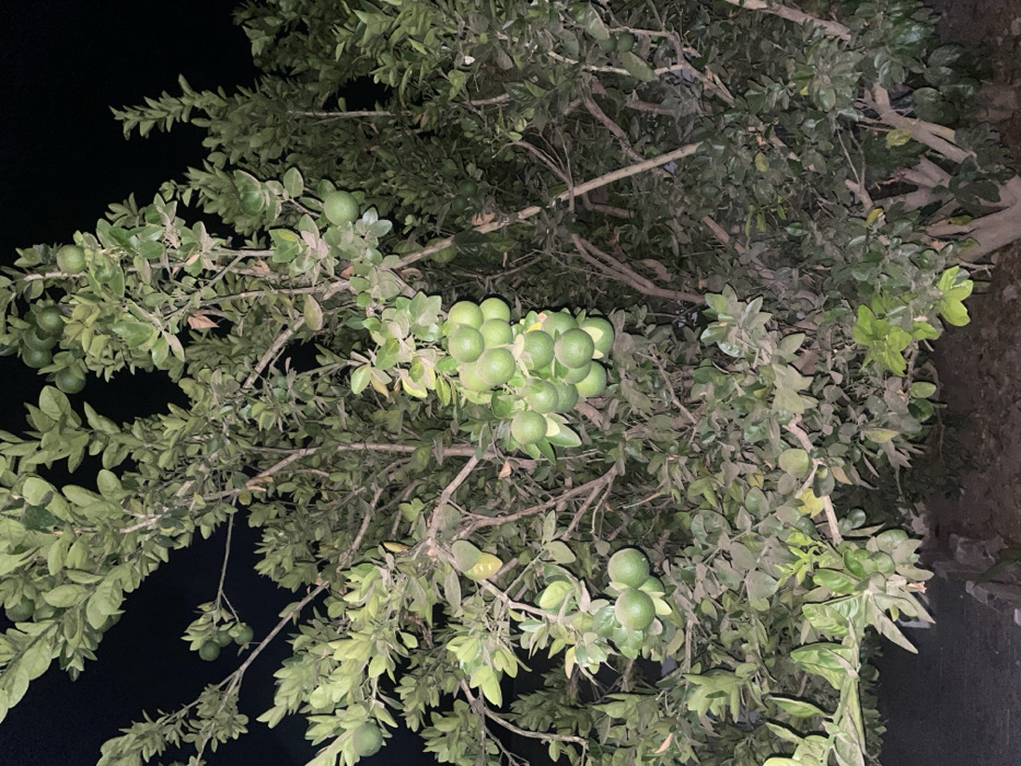A tree is heavy with numerous unripe green citrus fruits, clustered together amidst dense foliage. The leaves appear dusty or aged. The backdrop fades into the darkness of the night sky, suggesting the photo was taken after dusk. The branches and leaves are illuminated enough to create contrast with the nighttime background.