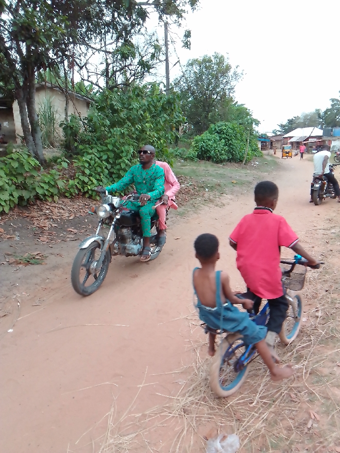 A man in a green suit drives a motorcycle on a dirt road with a passenger wearing pink. Two barefoot children ride a blue bicycle ahead. In the background, another person rides a motorcycle, and a yellow tricycle is visible near some buildings. Trees and foliage line the roadside. The overall scene appears to be in a rural or developing area.