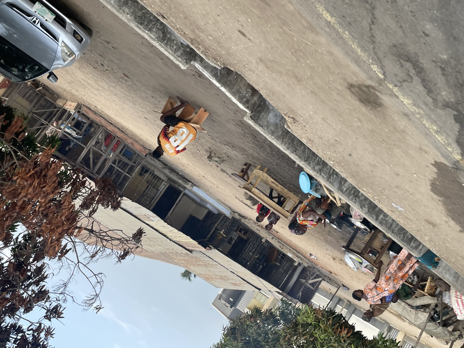 A street scene shows vendors with scales and goods displayed on tables. People are gathered, presumably shopping. A person wearing an orange jersey with a number 10 on the back sits on a cardboard box near a silver car parked along the side of the road. Buildings and trees line the street, indicating a commercial or residential area. The photo is taken at an angle.