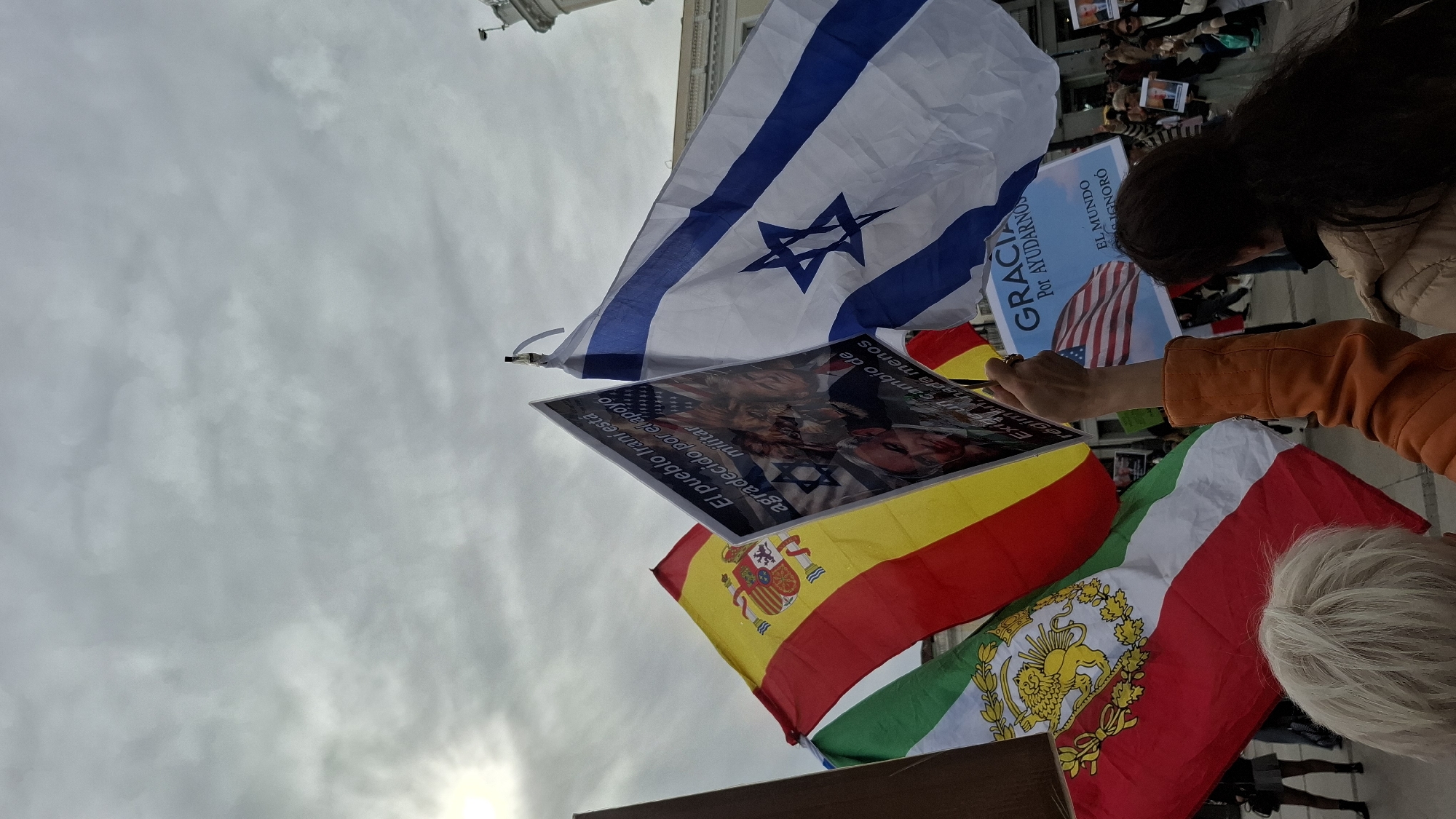 This image depicts an outdoor political demonstration occurring under an overcast sky in Puerta del Sol, Madrid, Spain. In the foreground, multiple individuals are gathered, displaying flags and protest signs. Prominently featured are three large flags: the national flag of Spain (red, yellow, red horizontal stripes with the coat of arms) on the left, an Israeli flag (white with two blue horizontal stripes and a blue Star of David) on the right, and an older Iranian flag (green, white, red horizontal stripes with a golden Lion and Sun emblem) partially visible on the far left. A central protest sign, held aloft by a person in an orange jacket, features superimposed images of American and Israeli flags over portraits of political figures, including Donald Trump and Benjamin Netanyahu. Spanish text on this sign reads: "El pueblo iraní está agradecido por el apoyo militar" (The Iranian people are grateful for military support) and "Exige un cambio de régimen y nada menos" (Demands a regime change and nothing less). To the right, another person with dark hair, seen from behind, holds a light blue sign displaying an American flag and the Spanish text: "GRACIAS Por AYUDARNOS" (THANK YOU For HELPING US) and "EL MUNDO IGNORÓ" (THE WORLD IGNORED). Several other individuals are visible in the background, indicating a crowd. The architecture of a large, classical-style building, consistent with the Real Casa de Correos, is partially visible in the upper right background. The ground appears to be paved.