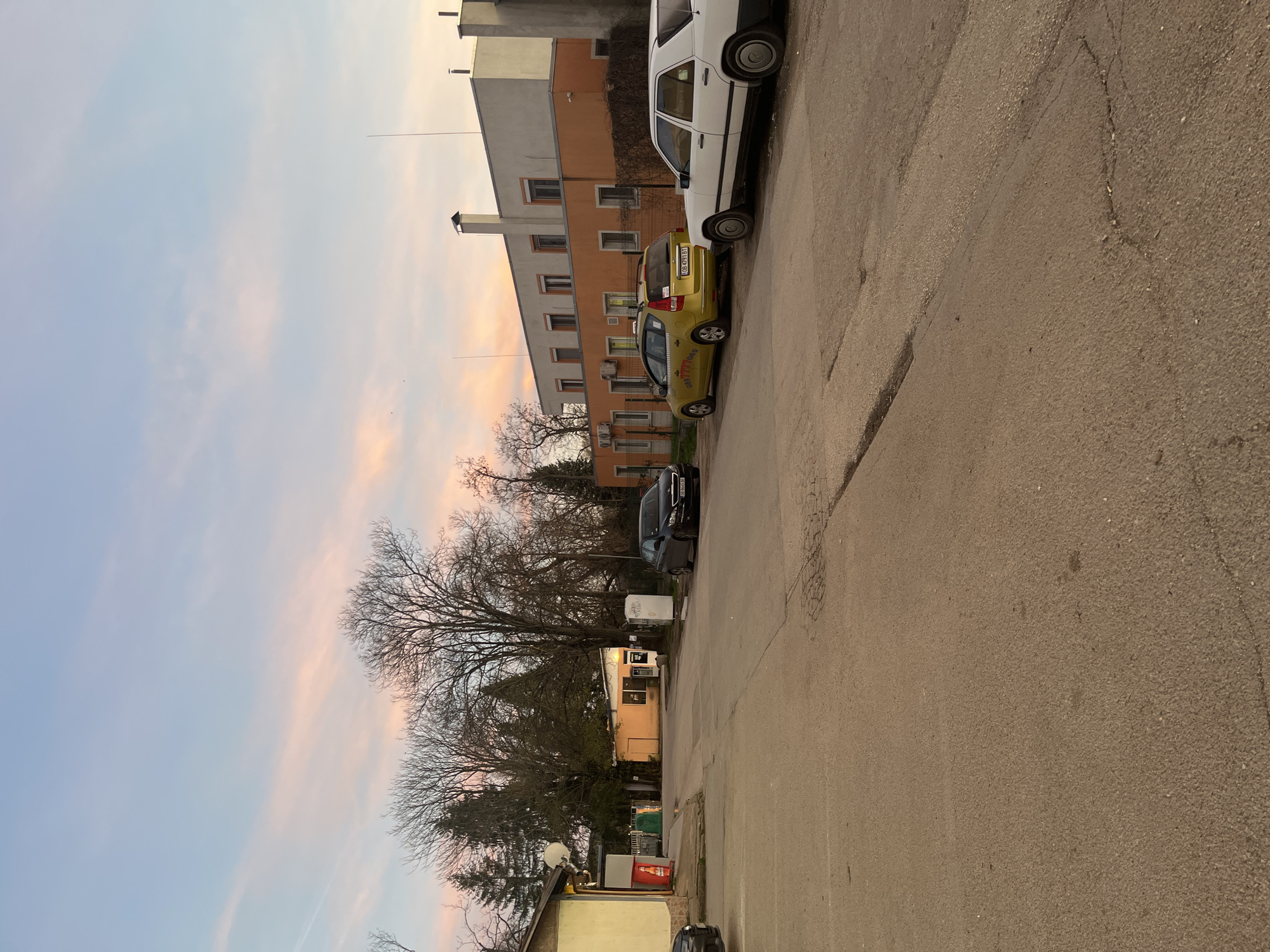 street scene in Lovech, Bulgaria. The view is taken from the roadside, looking towards a row of parked cars on the right. A white van, a yellow car, and a dark-colored car are visible. A multi-story building with orange facade is to the left of the cars. Trees are scattered throughout, mostly bare branches suggesting it might be late autumn or early spring. Further down the street, there is a smaller building with a storefront. The sky above features a gradient of light blue and pink, indicating dawn or dusk. The road is asphalt with cracks and patches.