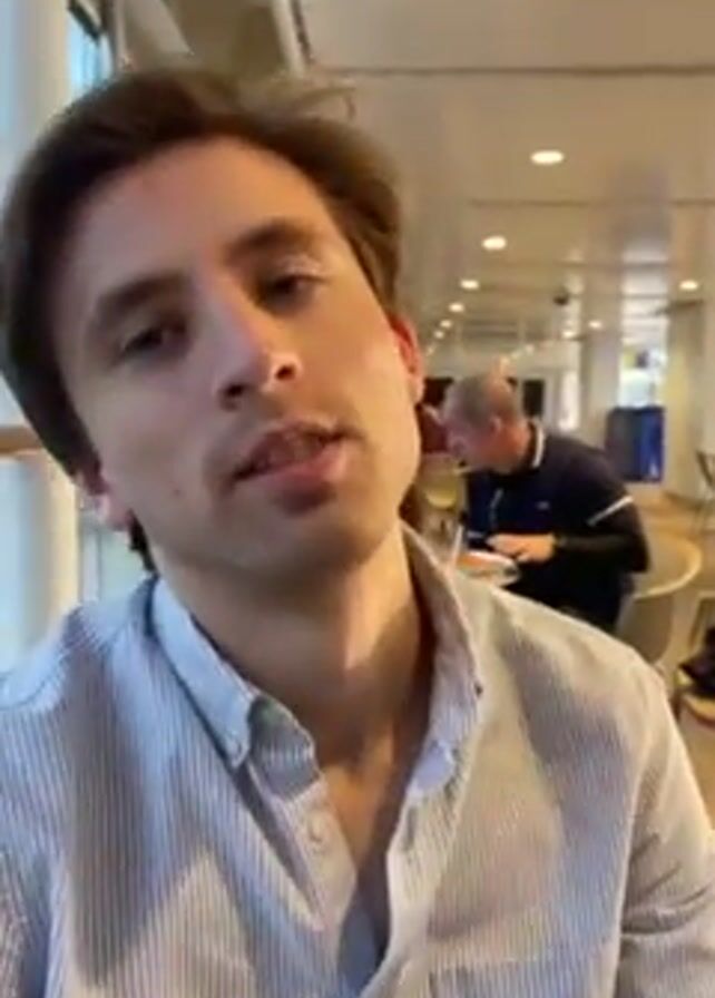 A person with short brown hair and a light blue striped shirt is talking to the camera