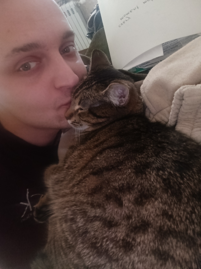 An indoor scene depicts an adult human male interacting with a domestic tabby cat. The male, visible in profile on the left side of the frame, has light skin and is observed pressing his puckered lips against the cat's head, indicating a kiss. His right eye is open and directed towards the viewer. He wears a dark shirt with a light-colored, stylized graphic on the left chest area. The cat, a brown and black tabby with visible stripes, is positioned to the right of the male, appearing in a relaxed state with its eyes closed or partially closed. The immediate background includes soft, light-colored textiles. In the upper left quadrant of the background, a white horizontal structure is visible, possibly part of a radiator or furniture. In the upper right quadrant, a crumpled piece of white paper with handwritten text, which appears to read "wowert / care," is present. The precise location within the city of Hlybokaye, Belarus, cannot be determined from the visual evidence.