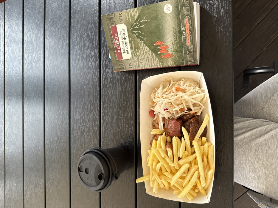 The image presents an overhead view of a casual dining scene at a dark, slatted table in Hrodna, Belarus. In the bottom portion of the frame, the lower legs of a person wearing light grey pants are visible, indicating they are seated at the table. To the left, a black disposable coffee cup with a black lid is positioned diagonally. Centrally, a rectangular white paper tray holds a meal composed of golden-brown french fries on the left, and a mix of dark brown meat chunks, sliced white onions, and shredded white cabbage with red specks on the right. To the right of the tray, a paperback book titled "Тайные виды на гору Фудзи" (Secret Views of Mount Fuji) by Viktor Pelevin is laid open or face up. The book cover features a stylized green mountain and five small orange figures walking at its base, along with an "18+" age rating. A blue bookmark protrudes from the top of the book. A partial view of a black chair arm is visible on the far right.