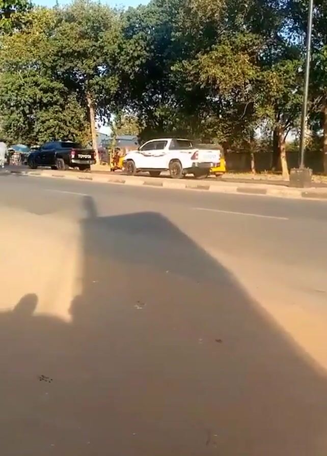 wide shot of a street during the daytime, with the camera angled to the left. The street is paved, and on the right side, a row of parked vehicles can be seen. There is a black Toyota pickup truck, a white pickup truck, and a yellow-orange auto rickshaw parked along the side of the street. Trees line the road on both sides. People are seen standing and interacting near the parked vehicles. A person on a motorcycle drives past the camera. Other cars pass by on the street. The camera's shadow is visible in the foreground on the dirt shoulder of the road.