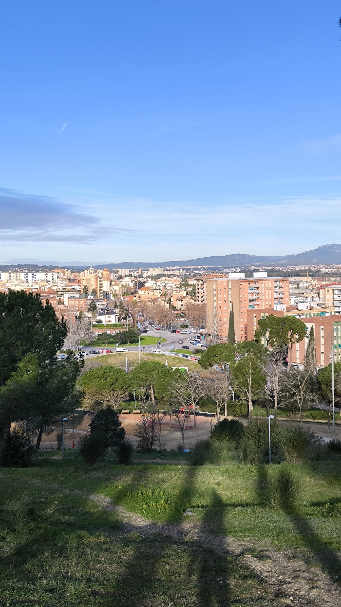 The image presents a panoramic high-angle view of Cerdanyola del Vallès, Spain, under a clear blue sky with minimal cloud cover. In the immediate foreground, a grassy slope with patches of dry earth is visible, partially obscured by prominent dark shadows, likely cast by individuals taking the photograph and nearby trees. A small park area with green and bare deciduous trees, benches, and red playground equipment is situated below the slope. The midground features an active urban environment centered around a large circular roundabout. The roundabout's central island is landscaped with grass and trees. Multiple vehicles, including cars and at least one bus, are observed navigating the roundabout and adjacent streets, indicating active traffic flow. Residential and commercial buildings of varying heights and architectural styles line the streets. Notable structures include a prominent multi-story peach-colored residential building on the right and a multi-story green building further right. Bare deciduous trees and evergreen trees are interspersed throughout the urban landscape. A dark, arch-like structure or sculpture is visible near the roundabout on the left. The background extends into a sprawling cityscape with numerous buildings, eventually meeting a distant range of hills or low mountains under the clear sky. No specific individuals are clearly identifiable, but their presence is implied by the shadows in the foreground and vehicular traffic.