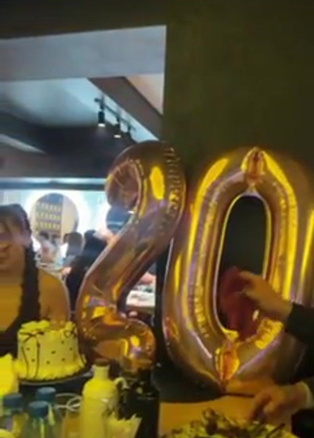 birthday celebration with two large, gold foil balloons in the shape of the number "20." A woman with long braids is seated at a table. In front of her is a small white cake decorated with black polka dots. The table is set with plates of food, bottles of water, and glasses. Other people are seated at the table and in the background. The room appears to be a restaurant with modern decor. Music is playing in the background.