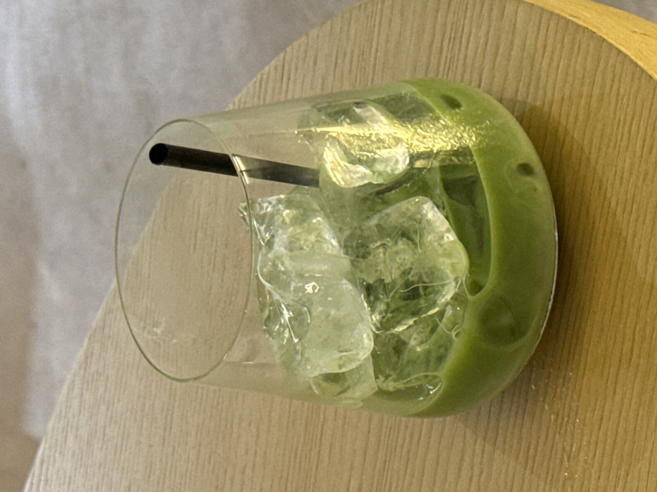 An eye-level close-up features a clear glass on a light wood surface, likely a table. Inside, large ice cubes suspend within a vibrant green liquid. A black straw extends from the glass, angled towards the viewer's left. The green liquid appears thick, possibly matcha or a blended beverage. The glass sits on its side.