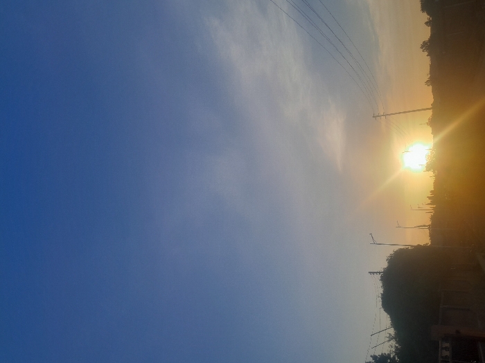 This image depicts a sunrise or sunset over Barakin Lerawi, Nigeria, captured from a low vantage point looking towards the horizon. The sky occupies the majority of the frame, transitioning from a deep blue at the top to a lighter, hazy blend of light blue, orange, and yellow towards the horizon, with sparse, wispy clouds. The sun is prominently visible in the lower-center-right, appearing as an intensely bright, circular white-yellow disc emitting strong, radial light rays and significant lens flare that extends downwards and to the left. Silhouetted against the bright horizon and sun are various urban and natural elements. On the left, a dense mass of dark green foliage from trees or bushes occupies the lower corner, partially obscuring a dark, low-lying structure or fence. Across the midground, several dark, slender streetlights with angled luminaires stand upright, extending into the sky. To the right, a dark utility pole supports multiple overhead power lines that stretch diagonally across the sky towards the upper-right. Additional indistinct, dark silhouettes of trees and distant structures are visible along the hazy horizon line. No individuals or active subjects are discernible within the frame. The scene is illuminated by the low-angle sunlight, indicating either dawn or dusk conditions.