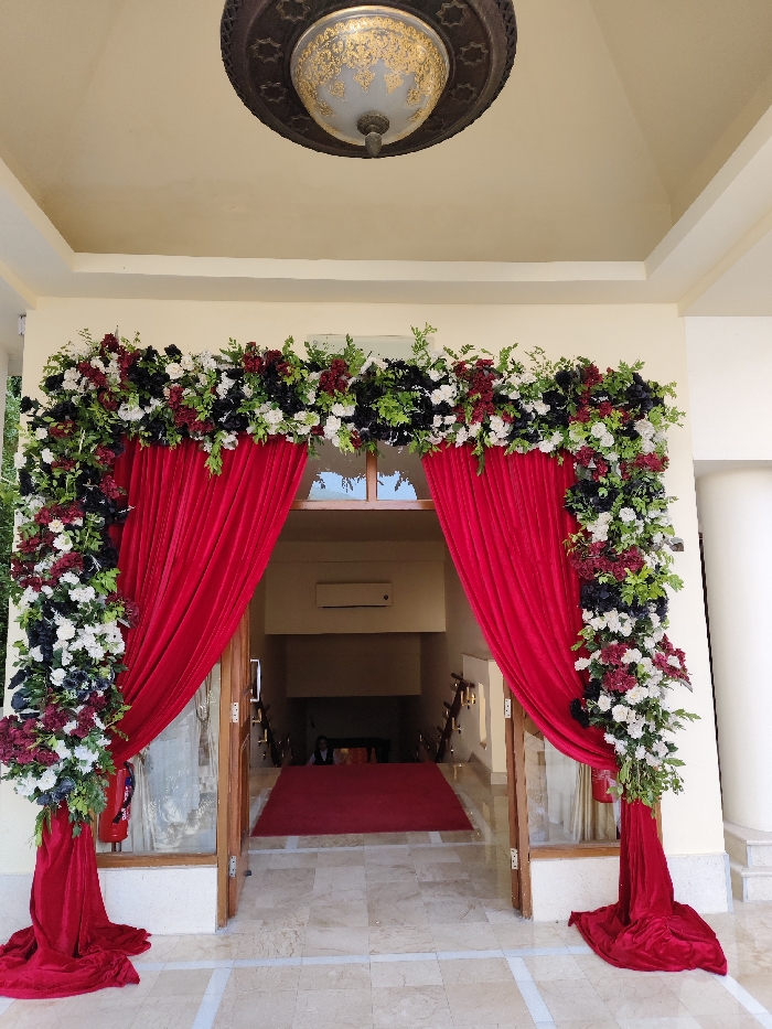 The scene depicts a decorated entrance of a building in Islamabad, Pakistan. An archway is elaborately adorned with extensive floral arrangements featuring white, dark red, and black flowers, interspersed with green foliage, spanning the top and extending vertically down both sides. Bright red velvet drapes are draped partially open within the archway, with their lower sections pooling on the beige and white tiled floor. Above the entrance, a prominent circular, dark bronze-toned ceiling light fixture with intricate gold detailing and a frosted glass cover is affixed to a cream-colored ceiling. The interior, visible through the opening, features a red carpet extending inward. A white wall-mounted split-unit air conditioner is situated on the wall above the carpet. To the right of the interior view, a wooden staircase with a banister descends. A lone individual is seated behind what appears to be a reception counter, partially visible in the mid-ground of the interior space. The exterior is brightly lit, contrasting with the dimmer interior.