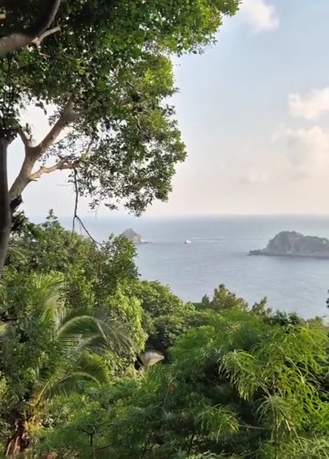 scenic view of the ocean and two small islands in the distance, framed by lush green trees