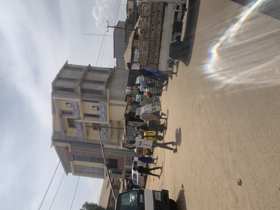 The image captures a bustling street scene in an urban area of Jos, Nigeria, under daylight with a cloudy sky. A multi-story building, exhibiting a mix of modern architecture with light-colored panels, dark tinted windows, and ornate balustrades on balconies, dominates the background; its upper sections show exposed concrete suggesting ongoing construction or an unfinished state. Along the right side of the unpaved street, several makeshift market stalls are set up, displaying goods such as stacked green plastic crates and various bottled beverages. Numerous individuals, estimated between ten and fifteen, are present on the street. A man in the central foreground, wearing a white t-shirt and dark trousers, walks towards the viewer, balancing a shallow, light-colored basin on his head. To his left, two other figures walk away, one appearing to carry a bucket on their head. Further right, several people are engaged in market activities, some pushing handcarts loaded with goods, including green crates. Vehicles include the front portion of a white truck with "TITAN" branding on the left, a white sedan in the mid-left, and a yellow auto-rickshaw (keke Napep) in the mid-center. On the right, a white light truck is heavily loaded with multiple stacks of cardboard boxes, some labeled "BIG H." Overhead power lines and utility poles are visible against the sky. A prominent lens flare is present in the bottom right portion of the image.