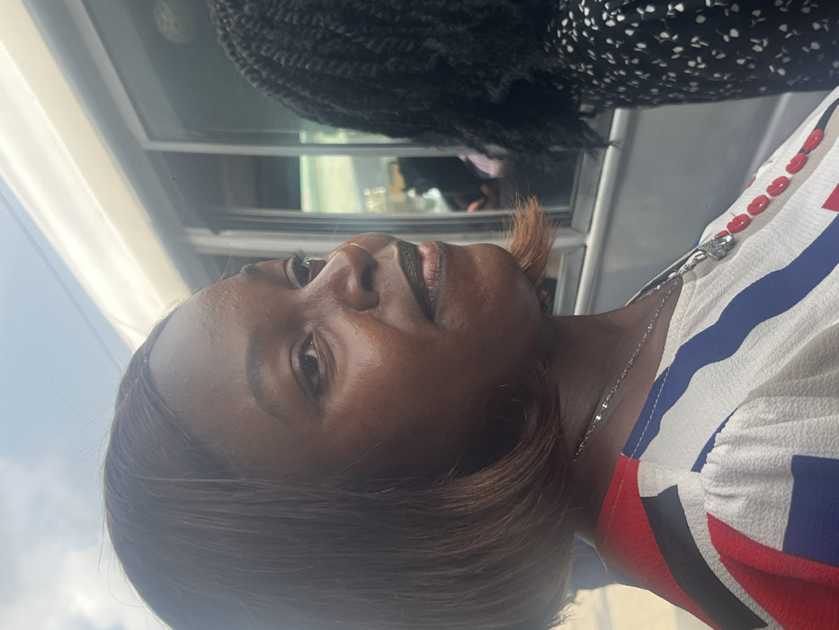 The image captures a woman in profile, positioned on the left, looking right. She has medium-dark skin, short reddish-brown hair styled in a bob, and wears dark lipstick. A silver-colored necklace with a pendant is visible around her neck. Her attire consists of a top featuring broad red, white, and blue stripes with red circular elements integrated into the white sections. Behind her, to the right, is the side of a light-colored passenger bus, characterized by dark windows and grey frames. A second individual with dark, braided hair and a patterned dark garment is partially visible behind the main subject's right shoulder, suggesting they are also within or adjacent to the bus. The background indicates an outdoor, daytime urban setting under a bright sky. This scene is located within an urban area of Lagos, Nigeria, consistent with a public transport environment.