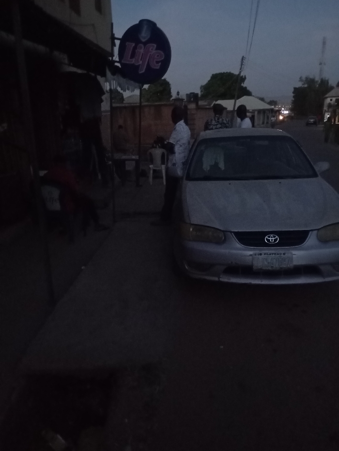 The image captures an outdoor urban scene at dusk or early night in Jos, Plateau State, Nigeria, identified by the license plate "JOS PLATEAU LSM-419XA" on a parked vehicle