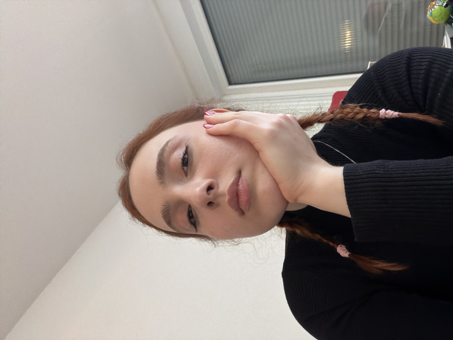 The scene is indoors, located in Eschau, France. A female individual is depicted in a close-up, high-angle shot. She has reddish-brown hair styled in two distinct pigtails, each secured with a pink elastic band. Her gaze is directed upwards towards the camera. Her chin rests on her right hand, which has fingernails painted pink with white patterns. She wears a black ribbed turtleneck garment and a thin silver necklace. The background consists of a plain light-colored wall on the left side of the frame. To the right, a window with horizontal blinds is visible, reflecting some light. A small, partially visible object, possibly a toy or decorative item with green, yellow, and blue colors, is present in the lower right corner, resting on an unseen surface.