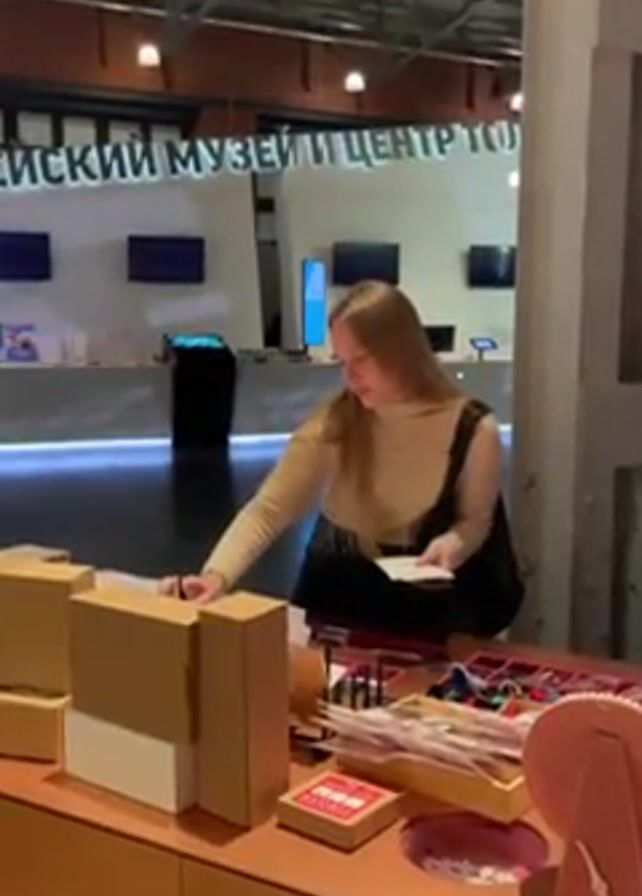 A young woman with long blonde hair stands behind a counter in what appears to be a museum or center based on the signage in the background, which is in Russian