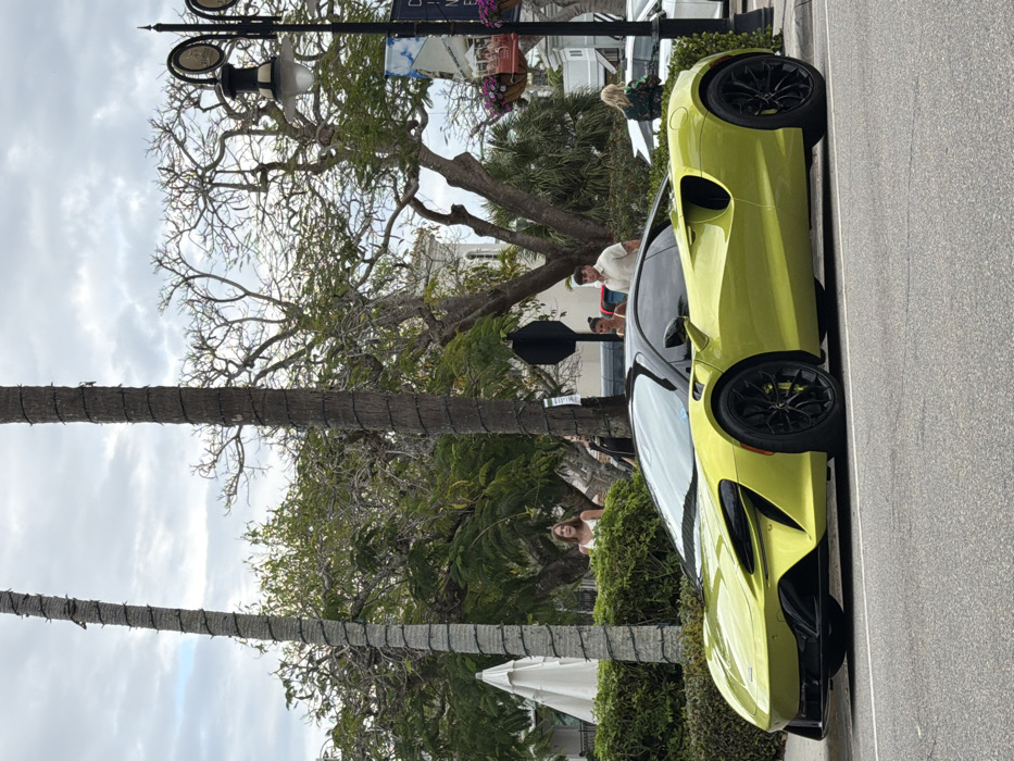The image depicts an upscale urban street scene in Naples, Florida. In the foreground, a vibrant lime green McLaren supercar, featuring a black roof and black multi-spoke wheels with yellow brake calipers, is parked on the asphalt street, facing left. Behind the vehicle and a low green hedge, several individuals are visible. On the left, a woman with brown hair in a white top looks right. Another person is partially obscured behind her. To the right, a group of three individuals includes a woman with dark hair in a light-colored top, a man in a light beige short-sleeved collared shirt exhibiting an arm tattoo, and a third mostly obscured person behind him. Further right, a blonde woman in a patterned jacket is partially visible behind a white sedan. The environment includes two tall palm trees, wrapped with thin strands, positioned prominently on the left and center-right. A white patio umbrella is open behind the hedge on the far left. In the background, a classical white building with a distinctive dome or cupola is visible, along with dense green foliage from various trees, some with bare branches. An ornate black street lamp featuring multiple lights and hanging flower baskets is on the right, accompanied by a street sign pole displaying a blue banner with white text. The sky is overcast with grey clouds. No specific actions or interactions are discernible beyond the individuals being present in the background.