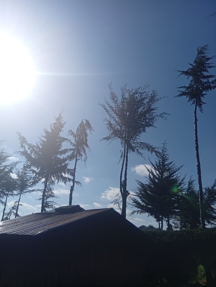 Against a bright blue sky with a blazing sun, stands a row of tall, spindly trees. Their silhouettes are punctuated by fluffy clouds. Below, the dark roof of a building stretches across the frame's lower half. The scene is a mix of natural beauty and architecture, with the stark contrast of light and shadow dominating the view. Some trees appear to be evergreens, while others have a more sparse, branch-like structure.