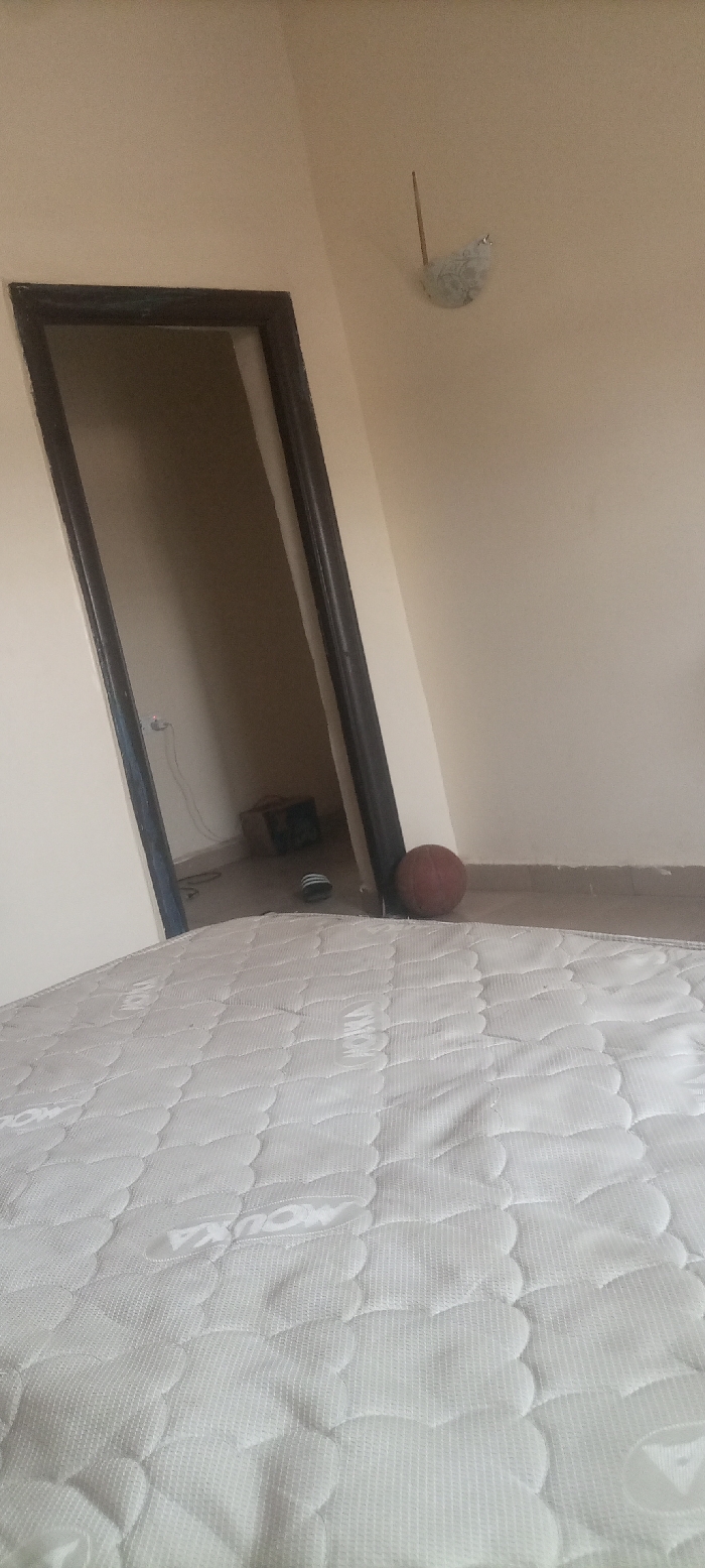 This image depicts an indoor scene within a room located in Howayi, Nigeria. In the foreground, a white quilted mattress, branded "MOUKA," rests directly on the floor, angled upwards from the lower left towards the right. A reddish-brown basketball is visible on the light-colored floor, positioned near the right edge of the frame, adjacent to a wall. An open doorway with dark-colored trim is centrally located in the midground, providing a view into an adjacent interior space. Within this visible portion of the adjacent room, an electrical wire with a small red indicator light extends from the wall, and a dark-colored sandal or slipper, alongside a dark rectangular object (possibly a box), are visible on the floor. In the upper right background, a light-colored object, possibly a fixture or decorative element, with a thin, brown stick-like projection, is affixed to the plain, light-beige wall. The walls throughout the visible areas are light-colored, and the floor appears to be a consistent light tone, possibly concrete or tiled. No individuals, actions, or direct interactions are present in the scene.