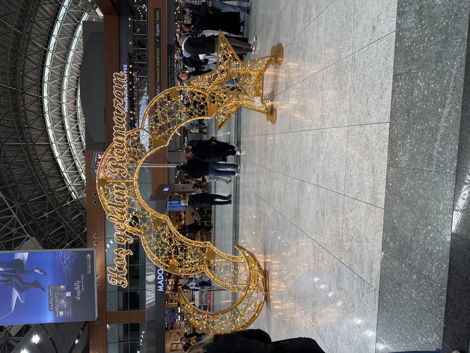 The image displays the interior of a large airport terminal, specifically identified as Sabiha Gökçen International Airport in Pendik, Turkey. A prominent golden, illuminated archway occupies the central foreground and midground. This archway features the Turkish phrase "Hoş geldin Ramazan" (Welcome Ramadan) in stylized, illuminated script at its apex. The left side of the arch is anchored by a large, illuminated golden crescent moon, while the right side is anchored by a large, illuminated golden star, both constructed with intricate wireframes and small lights. The floor is composed of large, light gray polished tiles, reflecting the golden lights of the decorations. In the background, numerous individuals are observed walking and standing, populating the terminal concourse. These individuals are dressed in varied casual to semi-casual clothing, consistent with airport travelers. On the left side of the background, a "MADO" store entrance is visible. Above it, a large vertical banner advertising "shop & fly" is displayed, featuring an image of two people on an airplane wing over a city. On the right side of the background, a "Starbucks Coffee" establishment is present, and below it, functional airport signage reads "Yolcu / Domestic Departures" and "Kapılar / Gates" in Turkish. The ceiling is a high, arched structure composed of exposed metal framework. The scene depicts a festive atmosphere within an active travel environment.