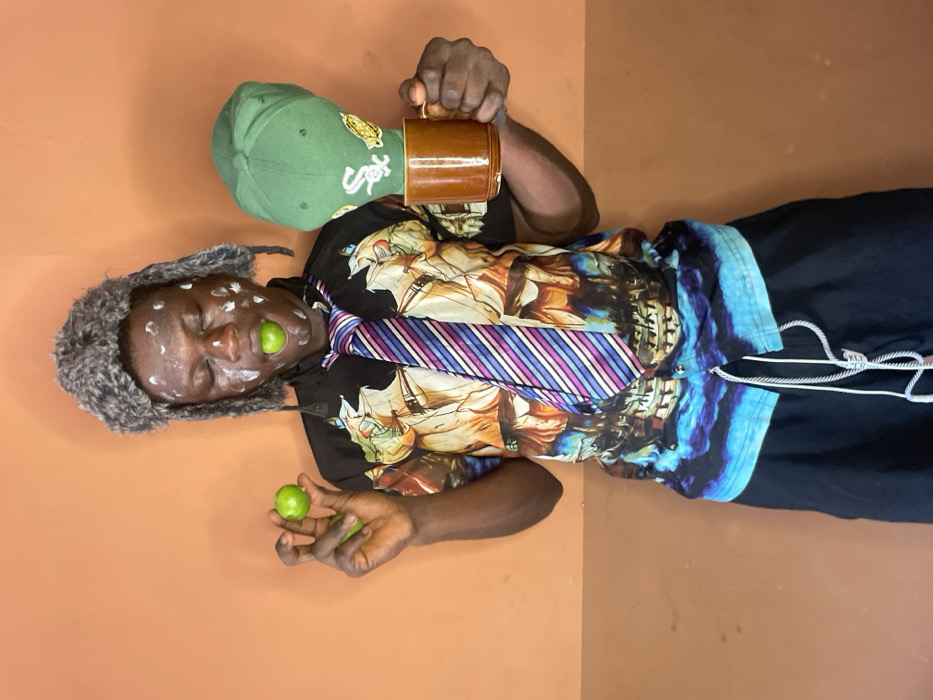 An individual stands against a two-tone wall, orange-brown in the upper section and a darker brown below, in Mosafejaw, Nigeria. The person wears a grey, furry ear-flap hat and a short-sleeved collared shirt depicting sailing ships on an orange-brown background transitioning to blue waves at the bottom, paired with black shorts featuring a white drawstring. A multi-striped necktie (purple, blue, white) is loosely tied over the shirt. White, dot-like markings are present across the closed eyes, forehead, cheeks, and nose. A small green spherical object is held between the lips. The right hand grasps two additional small green spherical objects. The left hand holds a brown ceramic mug, from which an inverted green baseball cap, featuring a white "SOX" logo and yellow accents, emerges.