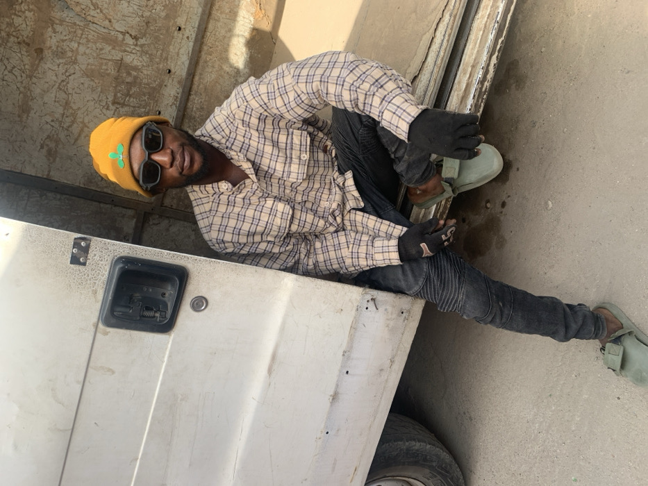 A male subject is seated within the open cargo bay of a white utility van, facing forward. He wears a mustard yellow beanie adorned with a green three-leaf clover emblem, dark rectangular sunglasses, a light-colored plaid button-up shirt, dark distressed jeans, black fingerless gloves (with a '5' and brown mark on the right glove palm), and light green slip-on clogs. The white van door exhibits scuffs, scratches, and dirt, with a black door handle and visible lock mechanism. A vehicle tire is partially visible beneath the door. The ground is a light-colored, unpaved surface. The interior of the van appears dark and indistinct. The scene takes place in an unspecified outdoor location within Jos, Nigeria.