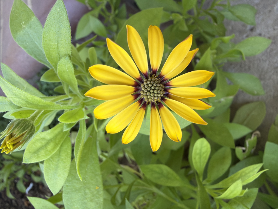 A vibrant yellow daisy-like flower with a dark brown center takes center stage amidst lush green foliage. The flower's petals are neatly arranged, radiating outwards. A partially closed flower bud sits among the leaves, suggesting new blooms to come. The leaves are a soft, textured green, providing a complementary backdrop to the flower's bold color. A concrete surface is faintly visible in the background.