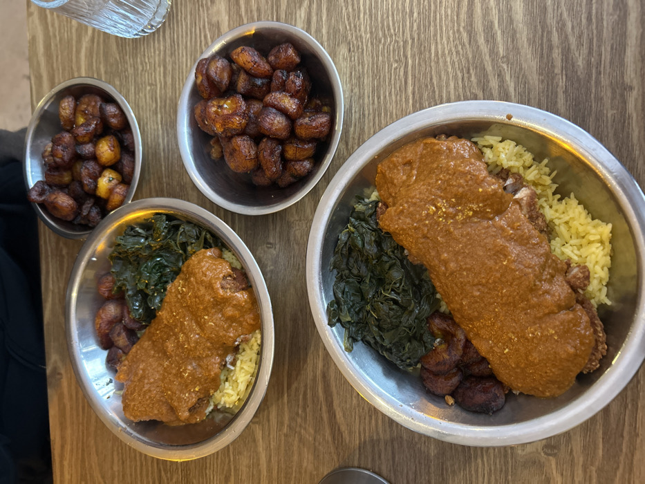 The image displays a dining setting on a light-colored wooden table, described as being located in Paris, France. Two main meals are presented in large, silver-colored metal bowls. Each bowl contains a base of yellow rice, topped with a piece of protein covered in a thick, reddish-orange sauce, accompanied by a serving of dark green leafy vegetables and several pieces of dark brown fried plantains. Additionally, two smaller, separate silver-colored metal bowls are visible, both filled with numerous pieces of dark brown, caramelized fried plantains. A clear, textured drinking glass is positioned on the upper right of the table. A portion of a person's dark clothing is visible along the top edge of the frame, and a silver utensil handle is partially seen on the far left. The scene depicts food prepared and set for consumption.