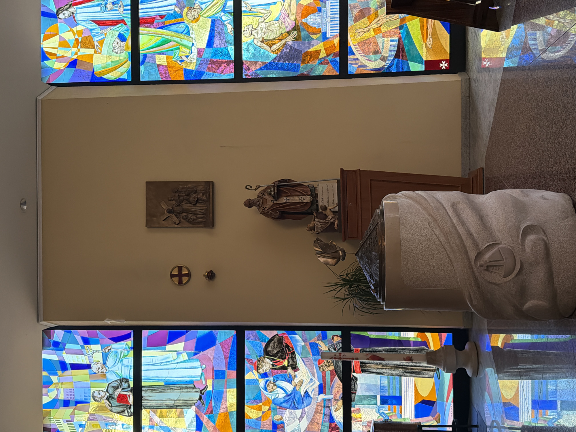 The image depicts a room interior with religious features, likely a church, in Tirana, Albania. There are stained glass windows visible at the top and bottom of the frame, filled with scenes featuring human figures in vibrant colors. On the wall between the windows hang a bronze plaque depicting figures in relief, a statue of a religious figure holding a staff, and a small golden cross. A stone sculpture of a head, possibly part of a baptismal font, is prominent in the right foreground. A wooden lectern and other liturgical objects are also present. The room is brightly lit, casting colorful reflections from the stained glass onto the floor.