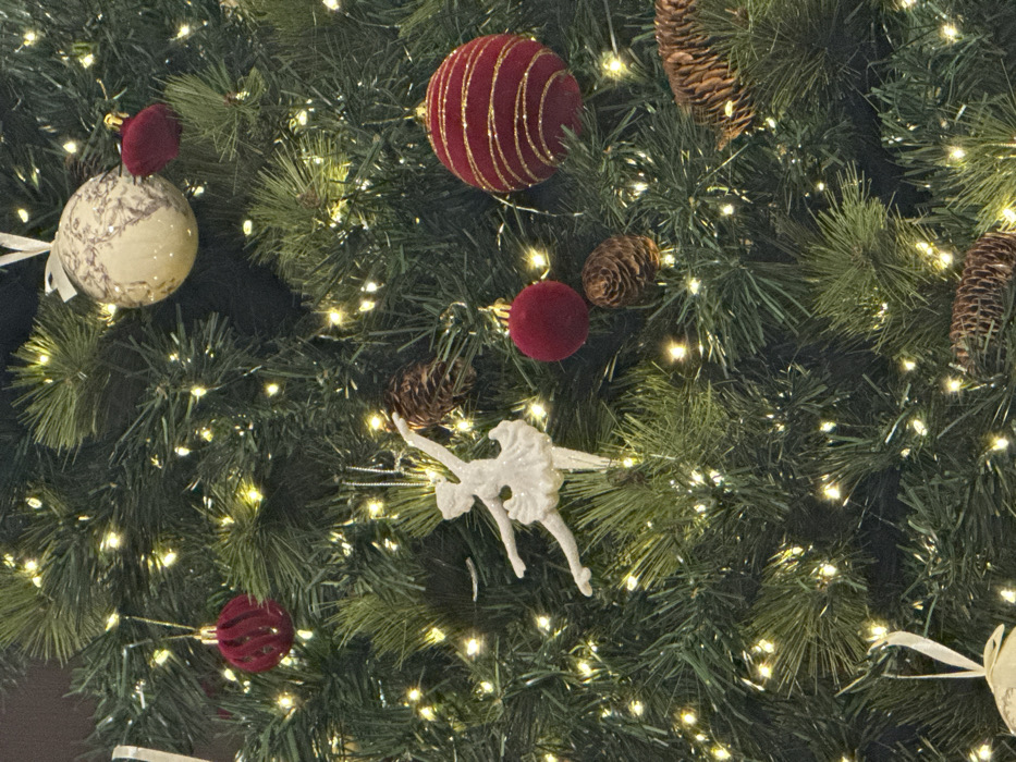 A vibrant Christmas tree sparkles with warm white lights amidst green pine needles. Ornaments include a red velvet ball with gold stripes, a beige patterned sphere topped with red, and small, solid red baubles. Several pine cones are scattered among the branches. A white, glittery ballerina figure is prominently displayed. The decorations evoke a festive and cozy atmosphere.