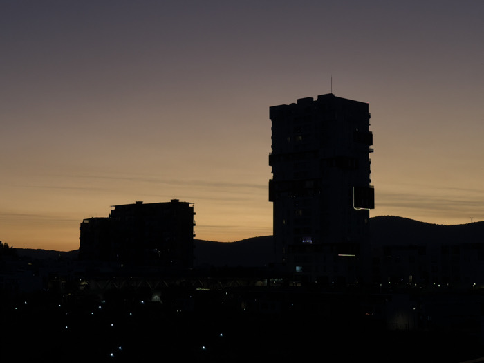 Two silhouetted buildings stand against a warm-toned sky at dusk. The taller building on the right has a blocky, multi-tiered design with a thin antenna on top. A smaller building on the left is partially obscured by the distant mountains. In the foreground, a dark cityscape with scattered lights suggests a lower elevation, possibly a residential or commercial area. The overall scene conveys a sense of urban tranquility at twilight.