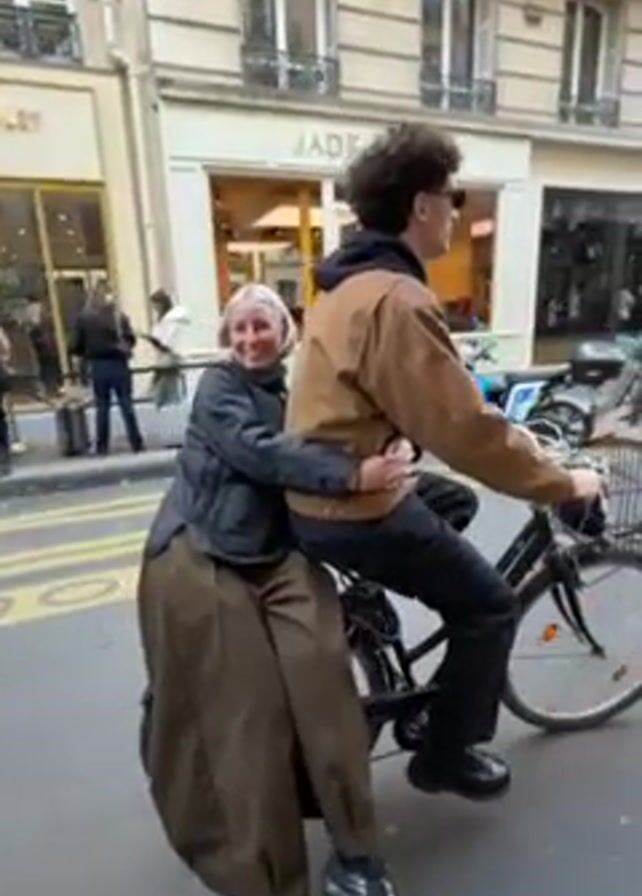 A woman with blond hair is riding on the back of a bicycle being pedaled by a man with dark curly hair. The woman is wearing a black puffer jacket and voluminous brown pants, and she has her arms wrapped around the man's midsection. The man is wearing a brown jacket, black pants, and sunglasses. They are riding on a city street lined with buildings, some of which have storefronts. Other pedestrians can be seen in the background. The camera appears to be following them.