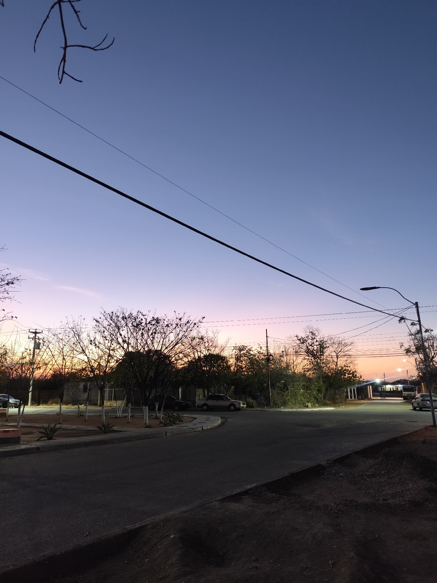 The image depicts a street scene in Las Hernández, Venezuela, at twilight. The sky transitions from a bright orange-yellow at the western horizon to lavender and deep blue overhead. A dark asphalt road curves from the lower-left to the middle-right of the frame, with an unpaved, dark earthen area in the immediate foreground on the right. On the left side of the road, a sidewalk borders a small landscaped median featuring multiple slender trees with white-painted lower trunks and agave plants. A light-colored sedan is parked to the left of this median. Further back on the left, a utility pole supports multiple overhead wires. On the right side, an illuminated streetlight extends over the road. Numerous overhead utility lines span across the sky. Bare or sparsely-foliated deciduous trees silhouette against the sunset glow. In the middle distance, several vehicles are parked along the right side of the road, including a white van or bus and another light-colored sedan. Further down the street, several structures are visible with internal lighting, and two indistinct human figures stand near them. No overt actions or interactions are discernible among the human subjects or vehicles.