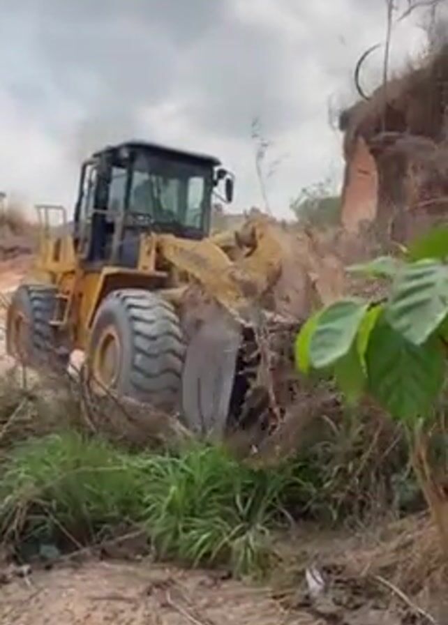 - "A yellow Liugong wheel loader moves through scrub vegetation towards a dirt slope, engaging its front bucket to clear away the brush" by FM-6XMFv1, licensed under CC BY 4.0
