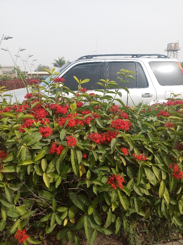 The image displays an outdoor scene in Gandu Albasa, Nigeria. A dense bush with vibrant green leaves and numerous clusters of small, bright red flowers occupies the lower and central foreground, extending upwards to obscure the mid-section of a vehicle. Behind this foliage, a silver SUV, equipped with a black roof rack and darkened windows, is partially visible. The SUV's passenger side, from its front door to the rear quarter panel, is discernible. The background features a bright, uniformly hazy or overcast sky. On the left, several streetlights with curved poles extend upwards. On the right, a weathered metallic structure, resembling a water tower, is partially visible against the sky. No individuals or discernible actions are present.