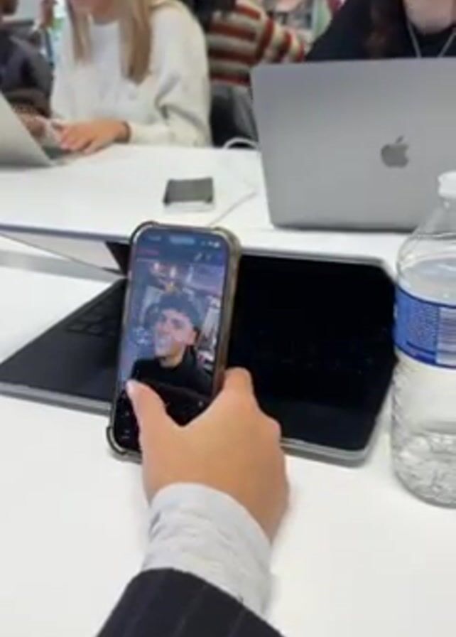 A person sits at a table in a bright room with several other people who are using laptops. The person in the foreground is holding a smartphone, scrolling through profiles on a dating app. An open laptop sits on the table next to the phone, and a bottle of water is on the right side of the laptop. The other people in the room are working on their laptops, some talking amongst themselves. The table is white and the room has a modern, collaborative feel.