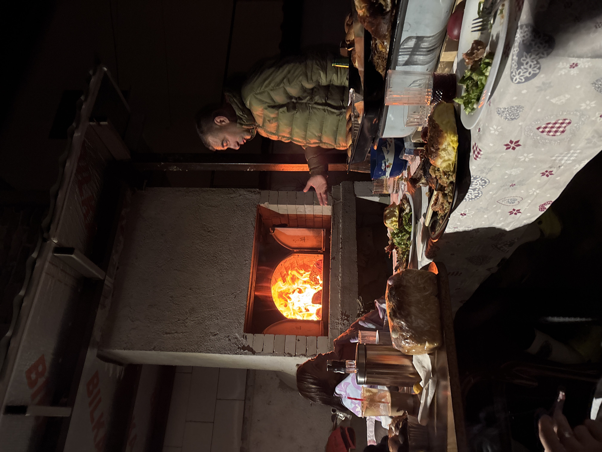 A dimly lit, upward-angled shot depicts a group of people gathered around a table laden with food. A man in a green jacket stands near a brick oven with visible flames inside. His hand is extended toward the oven. Food plates, drinks, and serving ware are arranged on a tablecloth with a patterned design. The location could be near Banya, Bulgaria, due to the branding of "BILKA" on a wall in the background.