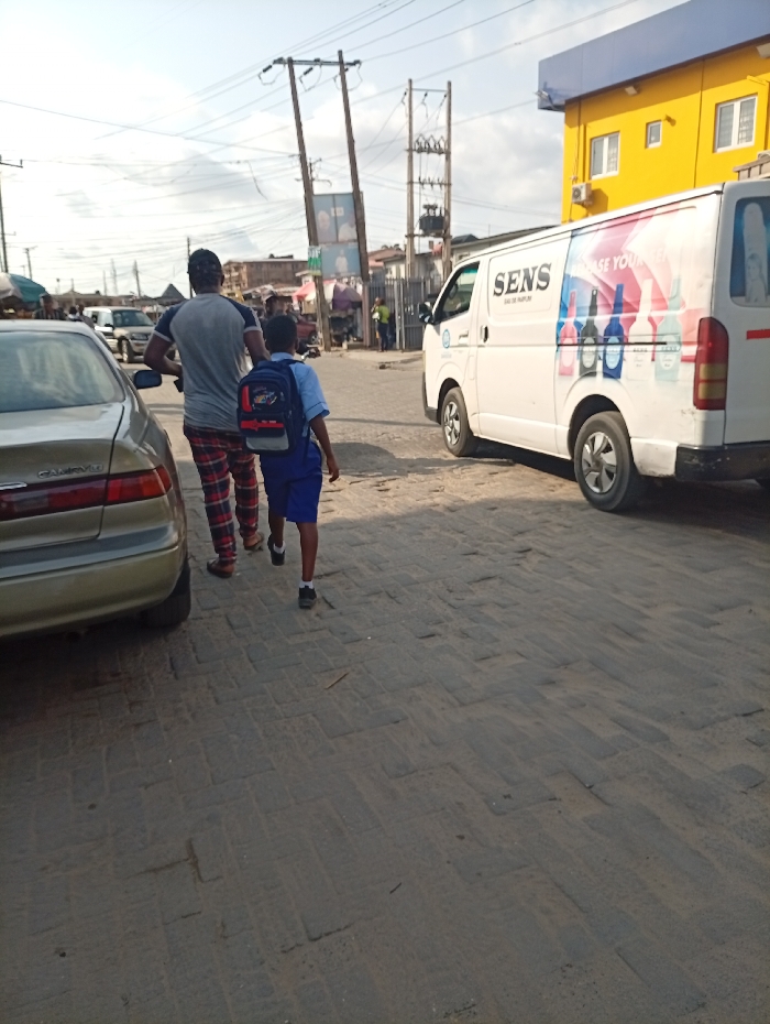 The scene is a street in Agani, Nigeria, observed under daylight conditions. The ground is paved with rectangular grey and brown interlocking blocks. In the mid-ground, an adult male, wearing a grey short-sleeved t-shirt and red plaid trousers, walks away from the viewer. He is accompanied by a child, presumably a boy, dressed in a blue school uniform (short-sleeved shirt, shorts, black shoes) and carrying a multi-colored backpack. They are proceeding along the left side of the paved surface. To the left of the walking individuals, the rear section of a gold-colored sedan, identifiable as a Toyota Camry V6, is partially visible. To the right, a white commercial van, possibly a Toyota Hiace, is parked, displaying "SENS EAU DE PARFUM" branding along with an advertisement featuring perfume bottles and the text "CHOOSE YOUR...". The background reveals a bustling urban environment. Multiple utility poles with a dense network of overhead electrical lines crisscross the sky. An electrical transformer is mounted on one of the poles. Beyond these, additional vehicles and structures are visible along the street, suggesting commercial activity. On the far right, a prominent two-story building with a yellow facade and blue trim, featuring multiple windows, stands behind the white van. The sky above is partially cloudy.