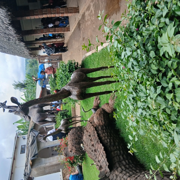 The image depicts an outdoor sculpture garden and adjacent architectural structures in Mweka, Tanzania, under an overcast sky. In the immediate foreground, dense green shrubbery with scattered small pink flowers partially obscures the lower portion of the scene. The midground features a manicured green lawn populated by multiple dark-colored animal sculptures. A large, textured crocodile sculpture, rendered in a dark bronze or brown material, rests prominently on the grass, with two smaller bird-like figures positioned on its back and near its head. Behind and to the left of the crocodile, three giraffe sculptures are visible; one large adult giraffe stands centrally, facing away from the viewer with its head turned to the right, and two smaller giraffes are positioned further back on the left. Additional smaller, dark animal sculptures (possibly ungulates) are discernible on the lawn in the background. A flowering red bush is situated behind the crocodile sculpture on the left. To the far left, an individual wearing a blue shirt is seated on the grass. A dirt or gravel path extends from the midground towards the background, separating the lawn from two buildings. On the right side of the path, a building with a prominent thatched roof and exposed brick pillars provides a covered walkway. Approximately ten individuals, appearing to be young adults or students, are present on this path and under the covered area. Several carry blue backpacks. Their postures indicate standing, walking, or congregating, with most facing away or partially obscured. One person in a light brown or orange shirt stands in the mid-background near a wooden fence or railing, holding a white object. To the left, a light-colored building with an arched entrance is partially visible. The distant background reveals green, tree-covered hills under a cloudy sky.