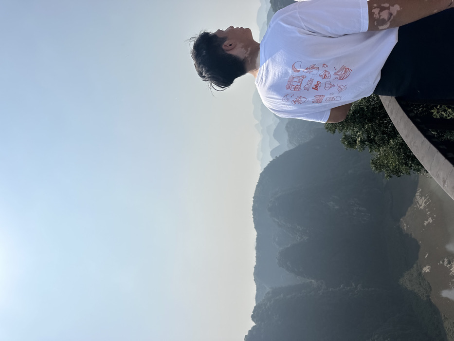 A person in a white t-shirt and black pants looks out over a landscape of mountains and water. The mountains are hazy and fade into the distance. The sky is clear and light blue. The person is standing on a ledge with greenery nearby. The angle of the shot makes it appear as though the image is rotated. The person is facing away from the viewer, looking out at the scenery.