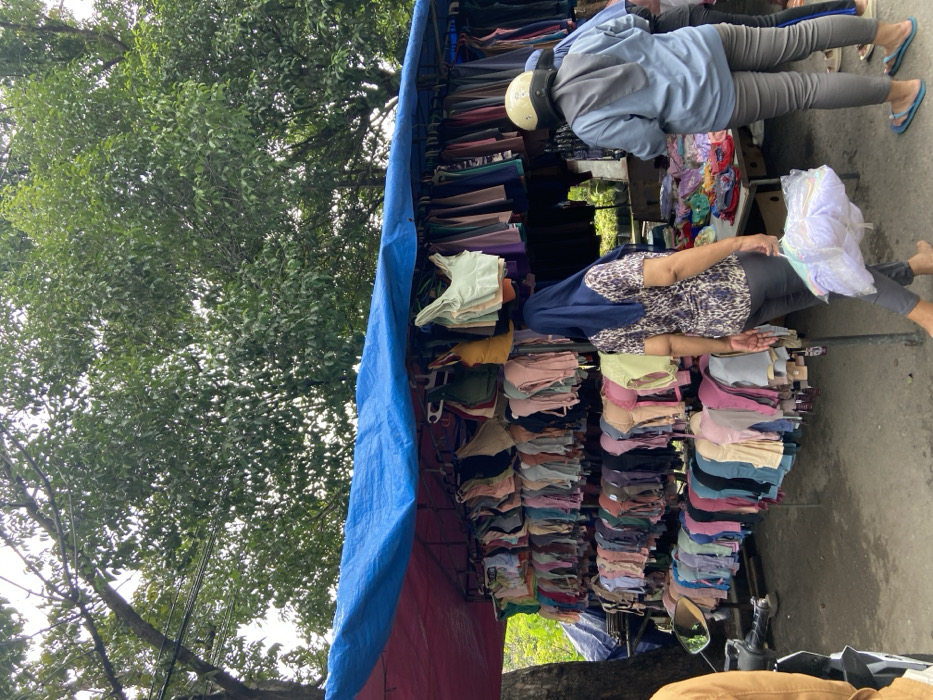 - "A market stall covered by a blue and red tarp displays rows of folded garments" by FM-htxI33, licensed under CC BY 4.0