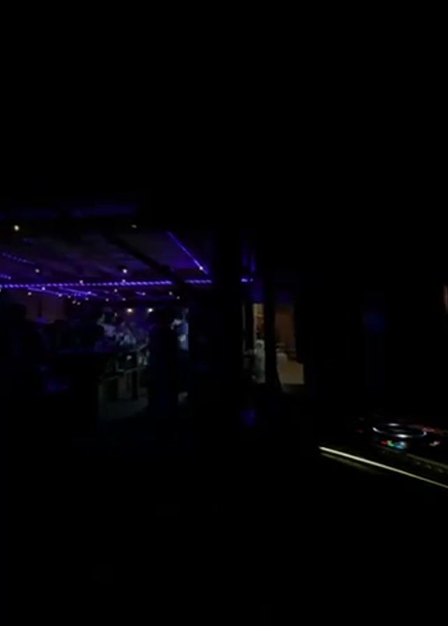 The video depicts a dimly lit indoor setting with a group of people socializing under purple lighting. Silhouettes of people are visible, some standing near a bar-like structure. In the foreground, there is equipment that appears to be DJ equipment, suggesting music or a performance might be taking place. The overall scene conveys a lively atmosphere.