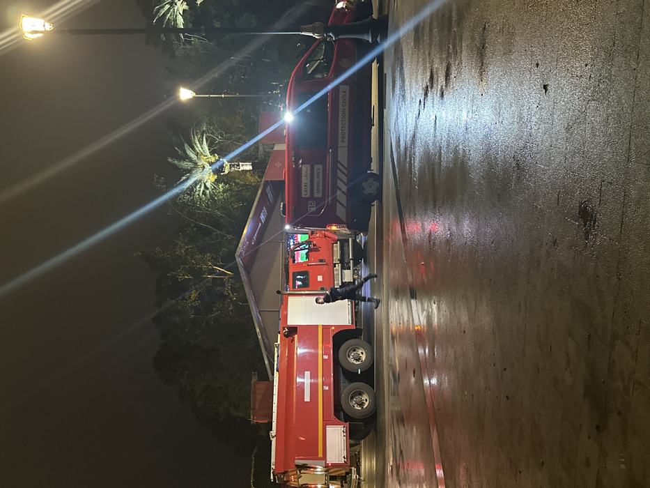A red firetruck with "Protection Civile" and "Ambulance" markings is parked on a wet, reflective road at night
