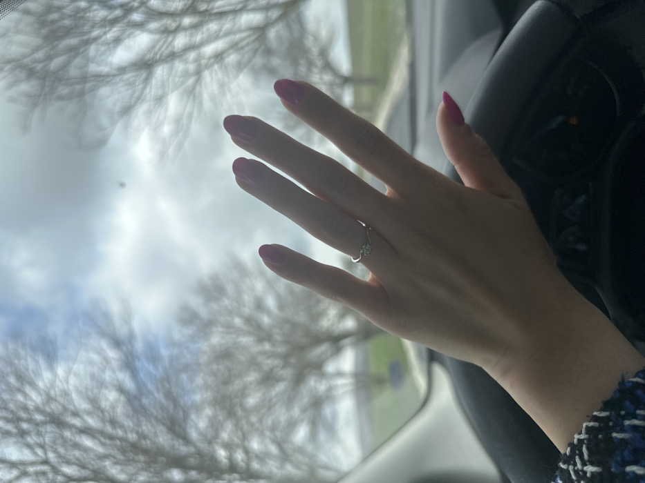 The image depicts a human left hand extended in the foreground, viewed from inside a vehicle in Izbul, Bulgaria. The hand exhibits manicured fingernails painted a magenta hue. A silver-toned ring with a single, clear, round-cut gemstone is present on the third digit (ring finger). A portion of a blue and white patterned woven garment is visible on the wrist. The upper section of a dark-colored steering wheel or dashboard, with partially visible illuminated instrument panel indicators, occupies the lower part of the frame. Through the vehicle's windshield, an outdoor environment is visible under a partly cloudy sky. The background features several leafless deciduous trees lining what appears to be a paved road or path that curves to the right. A flat green field extends to the left of the road. The scene suggests daylight during a cooler season such as late autumn, winter, or early spring.