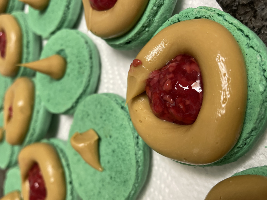 A close-up shows several green macarons with a tan-colored filling. Some of the macarons have the filling shaped into a simple dollop or cone, while others are topped with a circular ring of the filling, filled in the center with a red jelly or jam. The macarons are arranged close together on what appears to be a white surface.