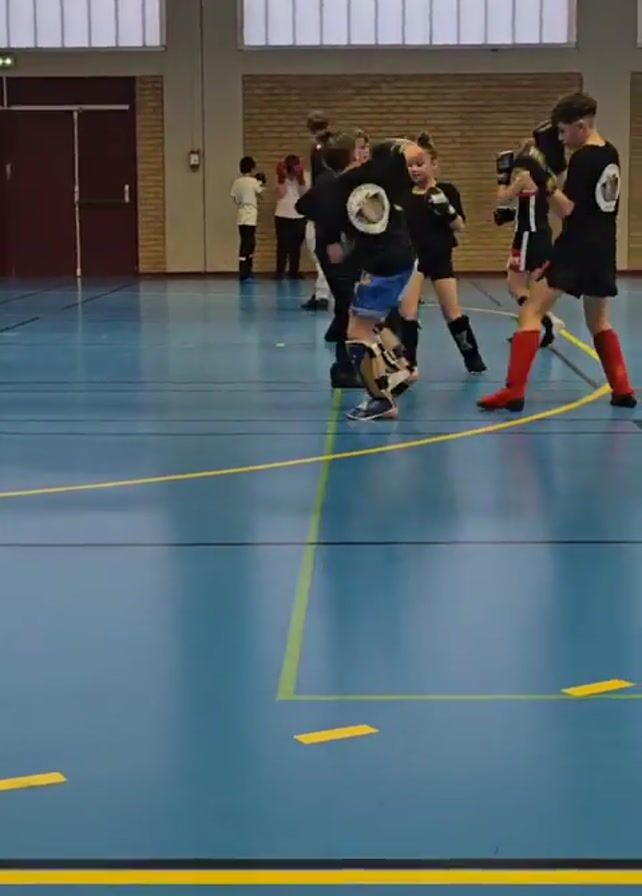 group of young people practicing kickboxing in a gym or indoor sports hall. They are paired up and wearing protective gear, including gloves, shin guards, and headgear. In the foreground, one participant kicks another, causing them to fall to the ground. Others continue practicing in the background. The hall has a blue floor with yellow lines, large windows providing natural light, and a brick wall at the back.